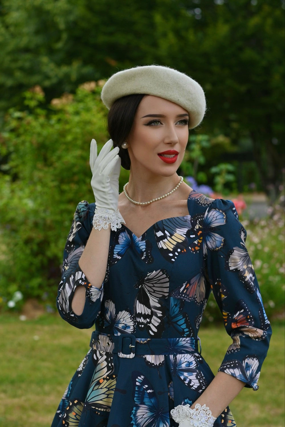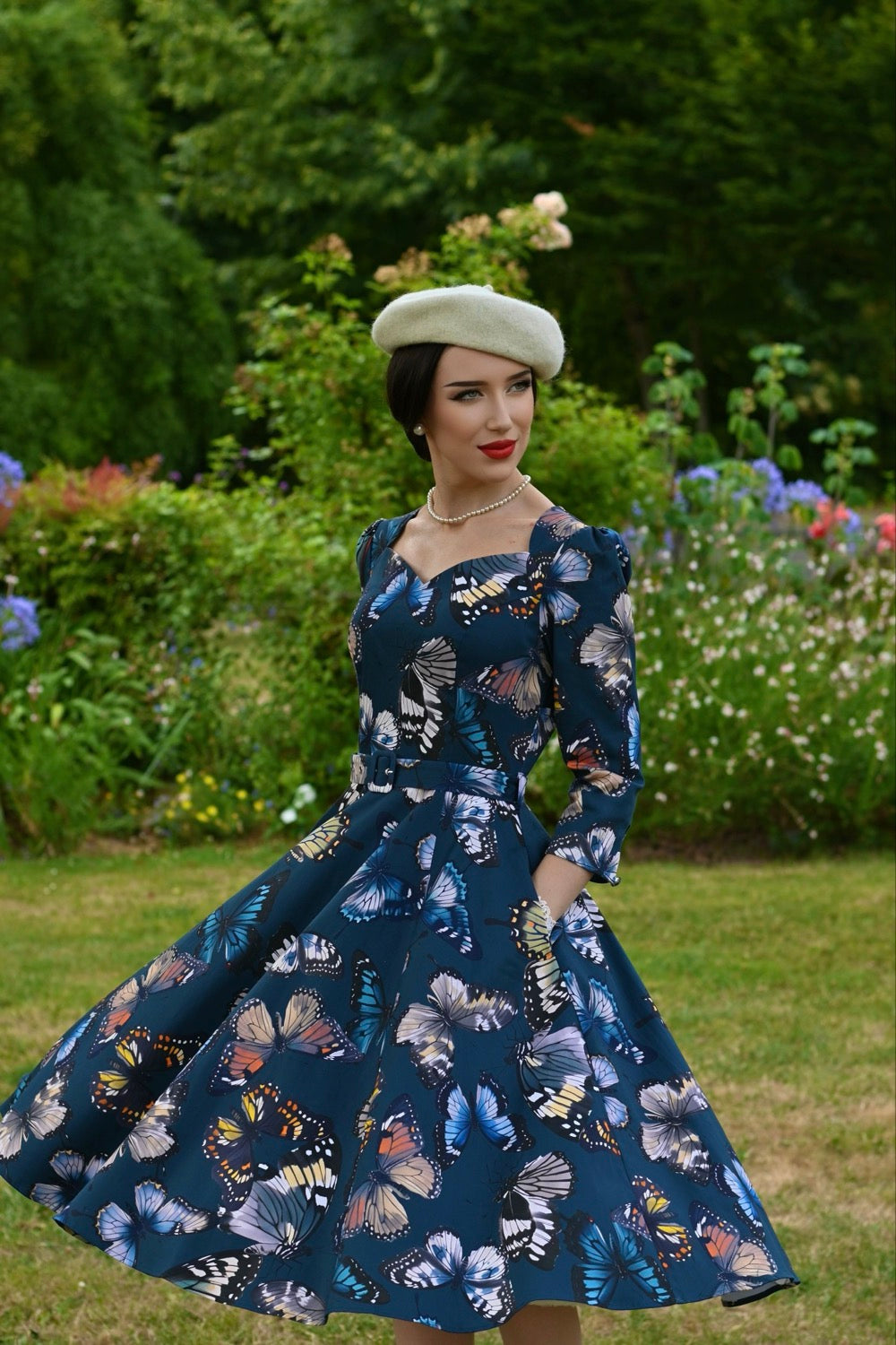 This enchanting butterfly print on a deep teal base, stands out from the crowd with its romantic fluttering motif. This style features a flattering sweetheart neckline to suit all and give that 50’s retro charm. The gathered ¾ length sleeves are accentuated with a charming sleeve cuff detail, complete with a keyhole and button closure. A self-fabric belt with a buckle, accompanied by belt loops, cinches the waist for a beautifully tailored look. Concealed back zip.