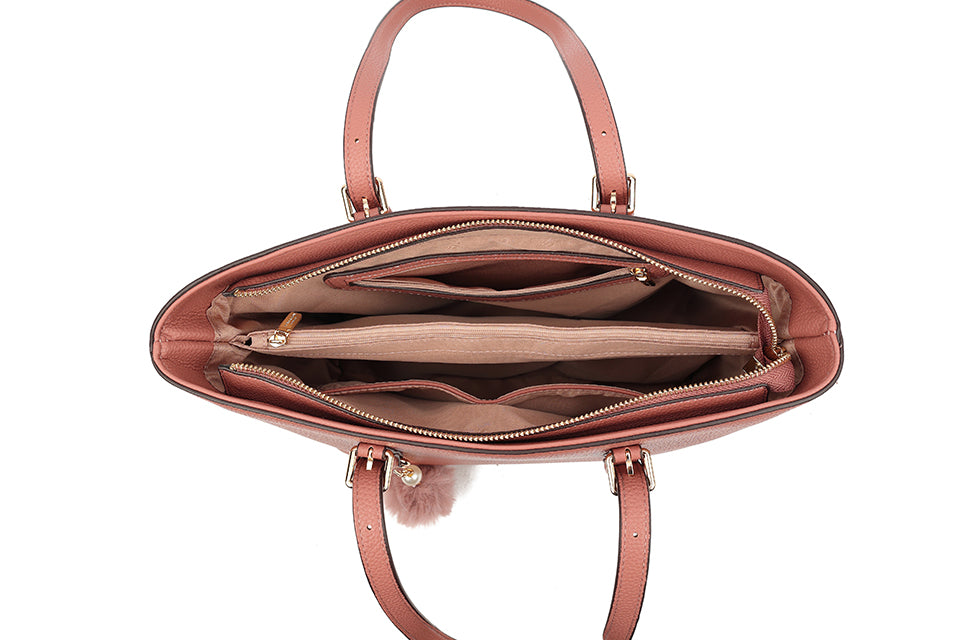 Zip top and 2 compartments inside, with two internal zipped pockets and two card/phone pockets.