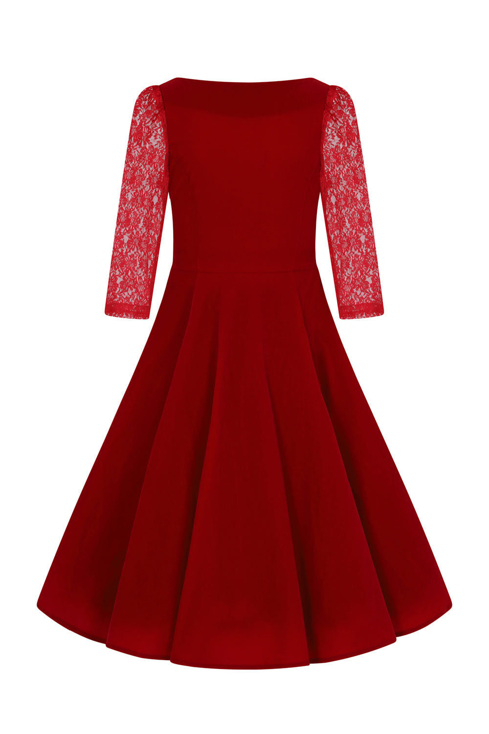 The perfect dress for a special occasion, with its striking shade of red velvet detailed with beautiful floral embroidery and delicate lace sleeves. With its fitted bodice and voluminous skirt, this style will have you swinging and twirling all through the winter months. Concealed side zip.