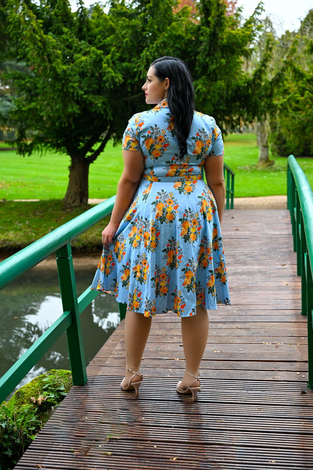 A delightful blend of vintage charm and modern comfort, this dress has a striking blue base adorned with vibrant orange and yellow florals, set amidst delicate, small-scale leaves and blossoms.