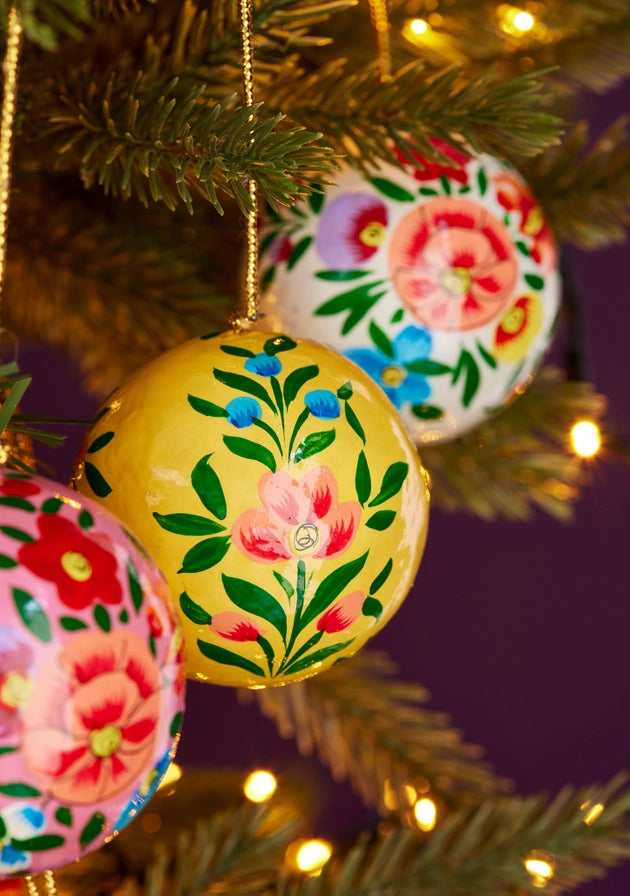 This luxurious hand painted floral Kashmiri Christmas tree bauble makes a magical addition to any celebration. The eco friendly, sustainable decoration comes in 7 vibrant varieties.