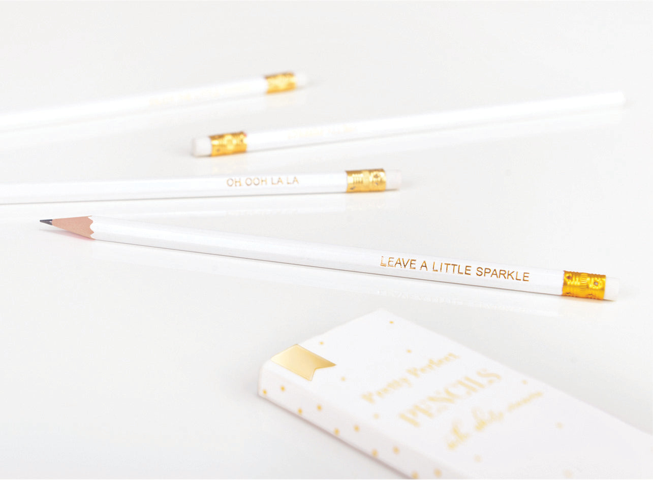 Set of 6 white graphite pencils with gold foil wording and white rubber.