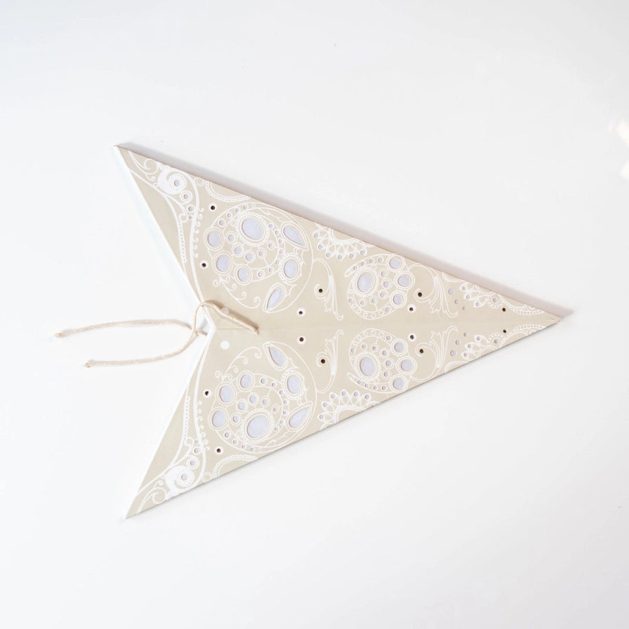 Clear teardrop-shaped tissue paper inserts cast a soft white glow against a neutral background; delicately etched screen printed design work creates a final flourish.