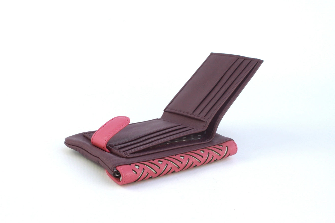 Leather purse with contrast panel and laser cut detailing.