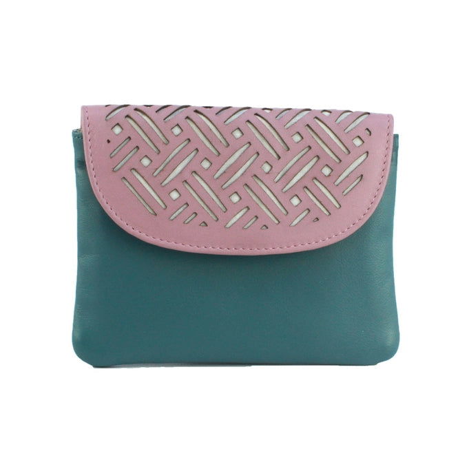 Leather purse with contrast panel and laser cut detailing.