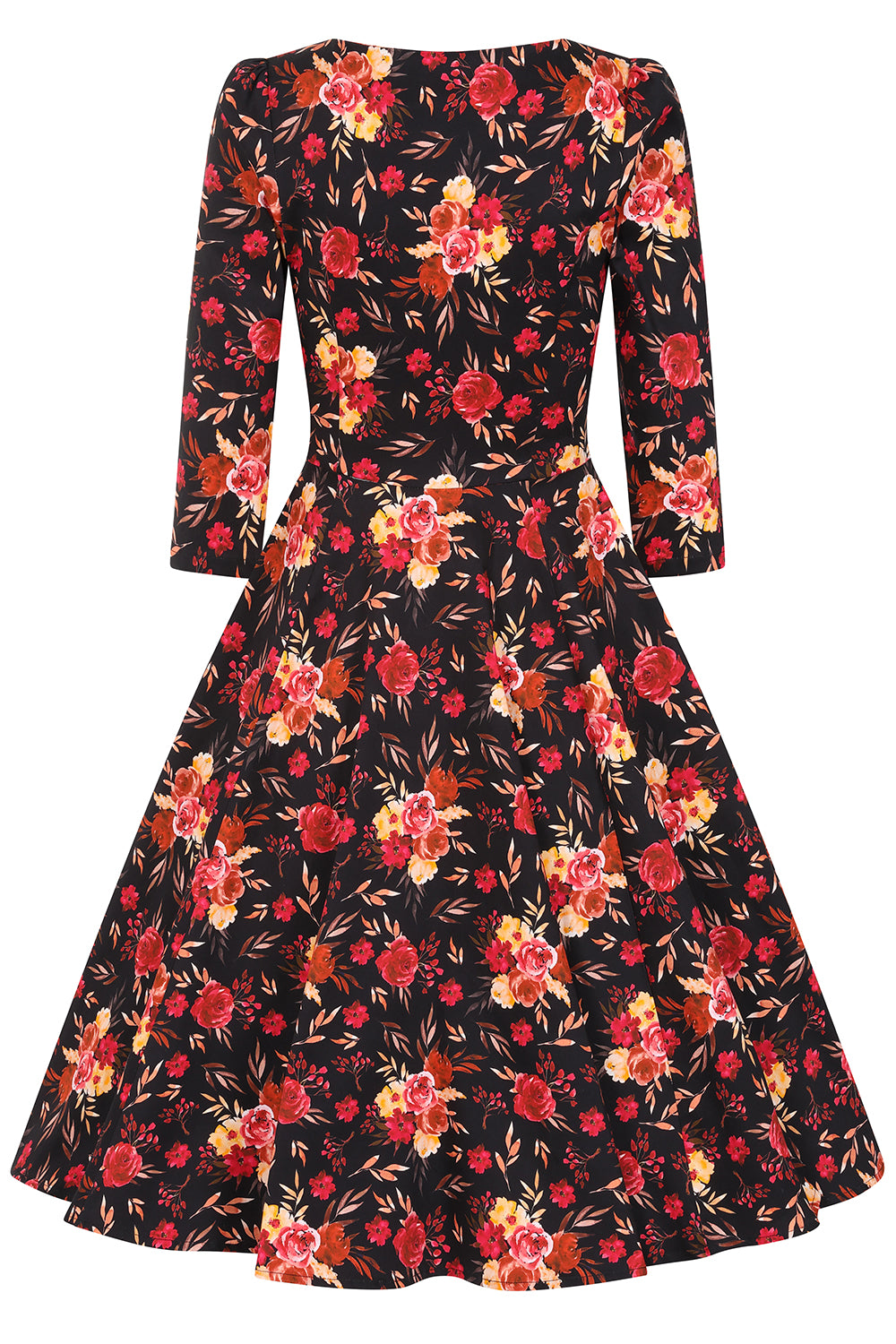 Featuring a flattering sweetheart neckline adorned with chic lapel detailing, this dress exudes vintage charm with a modern twist. The ¾ length gathered sleeves add a touch of sophistication, while the full swing skirt creates a graceful, feminine silhouette. Designed with practicality in mind, it includes a discreet side zip for a smooth fit.