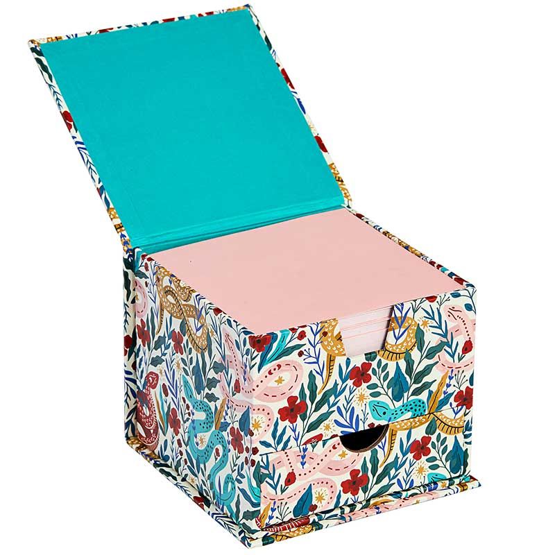 Note cube with lift up lid containing 300 memo sheets.