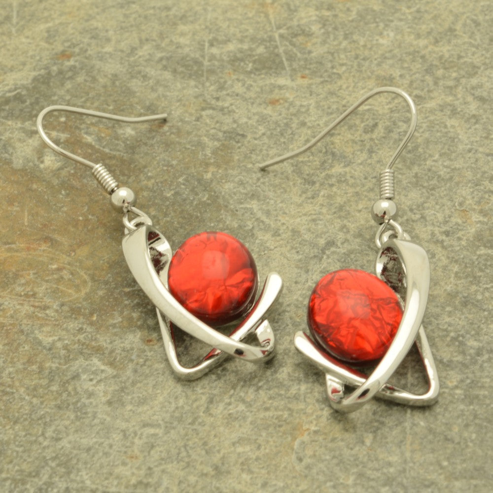 These drop earrings feature an eye-catching oval bead of scarlet red resin sitting within a silver coloured metal squiggle, which is almost a reverse ampersand.