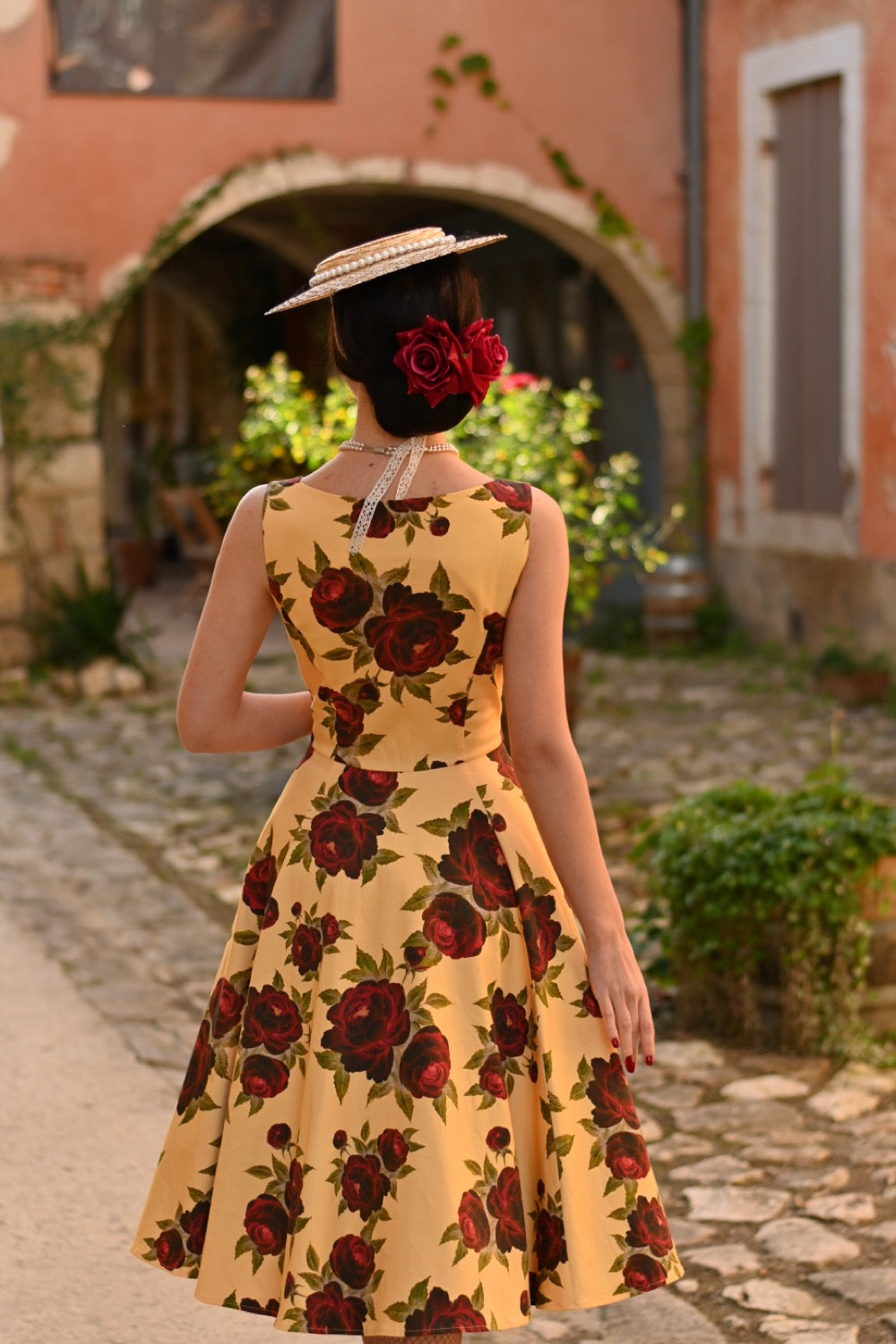 Pretty swing dress features a vibrant floral print set against a gentle yellow base, with rich red blooms and a lush bed of green leaves creating a striking yet elegant motif. The flattering boat neckline and sleeveless design lend a sophisticated silhouette.