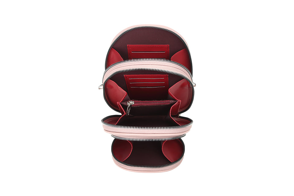 Two main zip pockets - one has a card section and the other has 2 compartments inside with a card section and central zipped pocket. Smaller zipped pocket on the front of the bag with photo mount.