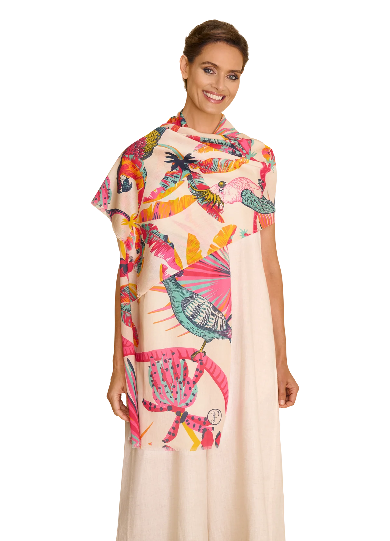 Looking to make your everyday beautifully ornate? Look no further! This is where luxury meets vibrancy. Radiant tones, tropical birds and florals dance together to create a wonderfully unique cotton scarf and fabulous addition to every capsule wardrobe.