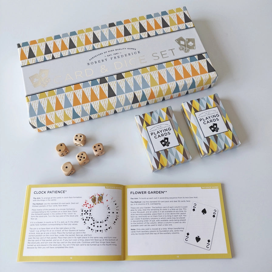 Presented in a stylish and sturdy box this set will make the perfect gift. Includes - 2 packs of playing cards, 5 wooden dice and instructions.