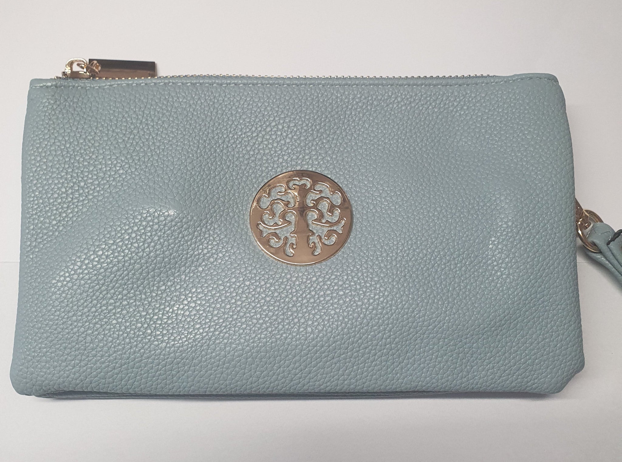 Comes with removable wrist strap and crossbody strap. Two compartments inside. Zipped pocket on back of bag and zip top for extra security.