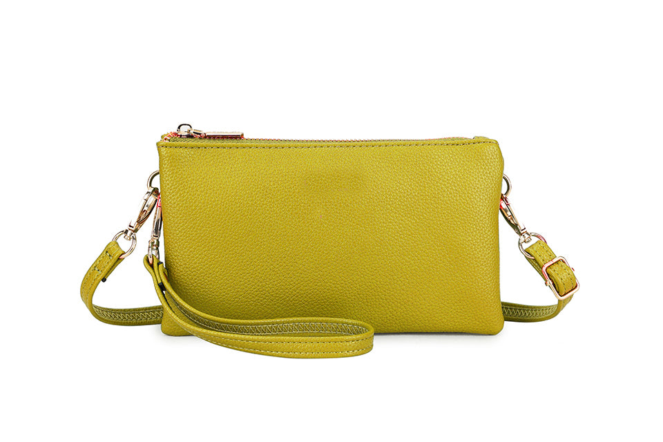 Comes with removable wrist strap and crossbody strap. Two compartments inside. Zipped pocket on back of bag and zip top for extra security.