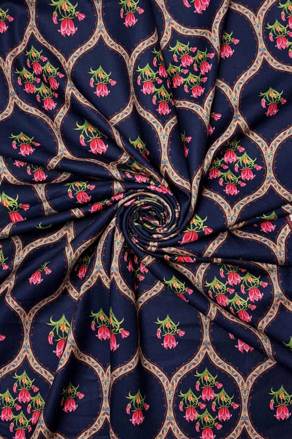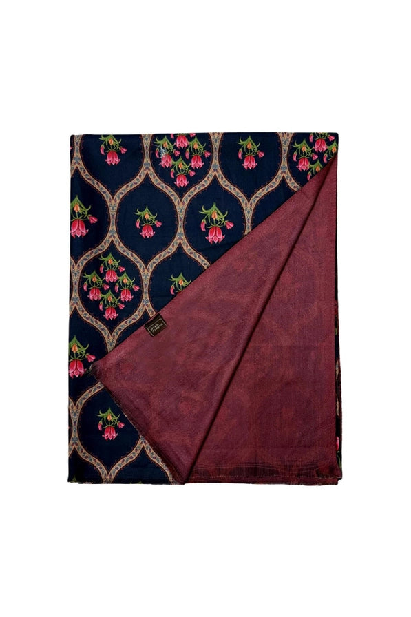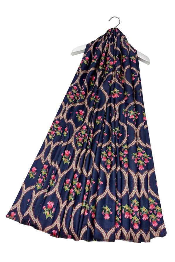 Soft medium weight wool mix scarf with a retro floral print and frayed edge.